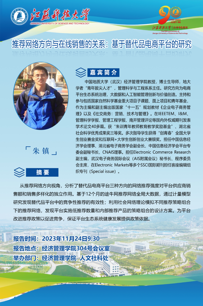个人简介:朱镇,中国地质大学(武汉)太阳成集团tyc33455cc教授,博士生导师,地大学者“青年拔尖人才”,管理科学与工程系系主任。研究方向为电商平台生态系统治理,大数据和人工智能管理创新与价值创造。主持和参与包括国家自然科学基金重大项目子课题、面上项目和青年基金,作为主编和副主编出版国家“十一五”规划教材《企业电子商务管理》以及《社交商务:营销、技术与管理》。在IEEETEM、I&M、管理科学学报、管理工程学报、南开管理评论等国内外权威期刊发表学术论文40多篇。获“朱训青年教师公司产品奖励基金”、湖北省社会科学优秀成果奖三等奖。多次指导员工获得“创青春”全国老员工创业赛金奖和互联网+老员工创新创业大赛银奖。担任中国信息经济学会理事、湖北省电子商务学会副会长、中国信息经济学会平台专委会副秘书长,CNAIS理事。担任Electronic Commerce Research副主编,武汉电子商务国际会议(AIS附属会议)秘书长、程序委员会主席,在Electronic Markets等多个SSCI国际期刊担任客座编辑组织专刊(Special issue)。