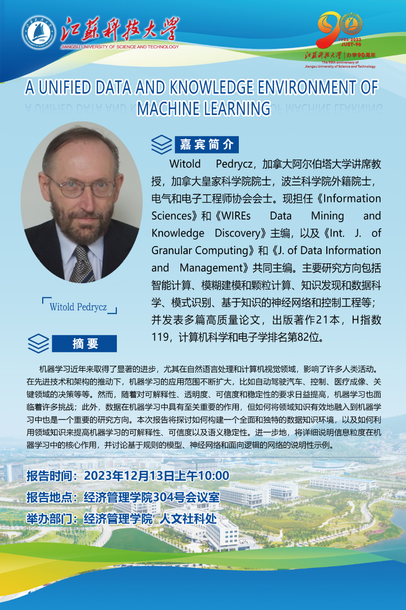 报告人简介:Witold Pedrycz,加拿大阿尔伯塔大学讲席教授,加拿大皇家科公司院士,波兰科公司外籍院士,电气和电子工程师协会会士。现担任《Information Sciences》和《WIREs Data Mining and Knowledge Discovery》主编,以及《Int. J. of Granular Computing》和《J. of Data Information and Management》共同主编。主要研究方向包括智能计算、模糊建模和颗粒计算、知识发现和数据科学、模式识别、基于知识的神经网络和控制工程等;并发表多篇高质量论文,出版著作21本,H指数119,计算机科学和电子学排名第82位。