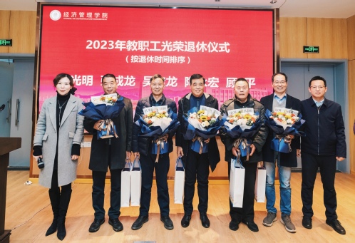 张光明、张成龙、吴定龙、陶永宏和顾平五位本年度荣休教师分享荣休感言。他们回顾了一生信守初心、教书育人的点滴故事,感谢公司的培养,感恩同事的支持,表示曾经见证了经管公司从系到院的发展历程,未来将笃定前行,与江科大、与经管院一起共续辉煌!公司新进教师代表献花五位荣休教师。