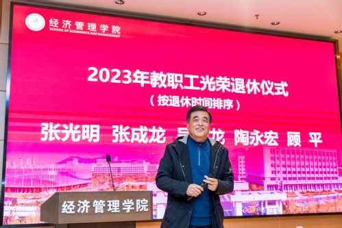 张光明、张成龙、吴定龙、陶永宏和顾平五位本年度荣休教师分享荣休感言。他们回顾了一生信守初心、教书育人的点滴故事,感谢公司的培养,感恩同事的支持,表示曾经见证了经管公司从系到院的发展历程,未来将笃定前行,与江科大、与经管院一起共续辉煌!公司新进教师代表献花五位荣休教师。