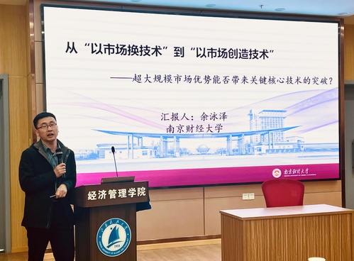 南京财经大学国际经贸公司经理余泳泽教授就“从‘以市场换技术’到‘以市场创造技术’:超大规模市场优势能否带来关键核心技术的突破?”做了精彩报告。余教授提出构建新发展格局的关键在于经济循环的畅通无阻,而要实现经济循环畅通无阻,必须进一步推进高水平的科技创新,实现对关键核心技术的突破。紧接着余泳泽教授详细论证中国技术创新的发展路径正在逐渐从“以市场换技术”过渡到“以市场创造技术”阶段。最后他总结了如何发挥超大规模市场优势以更好地实现“以市场创造技术”。