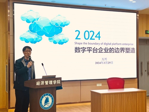 南京财经大学教务处副处长万兴教授围绕“数字平台企业多重边界决策的机理研究”主题展开报告。他首先指出数字平台企业的边界塑造不同于传统企业的边界塑造。随后重点介绍了数字平台企业面临多重边界选择,以及围绕数字技术的资源重构如何改变了企业内部关系,和企业与外部之间的关系。他最后总结到数字平台企业所构建的平台生态系统使得平台企业与外部环境之间的边界变得模糊。