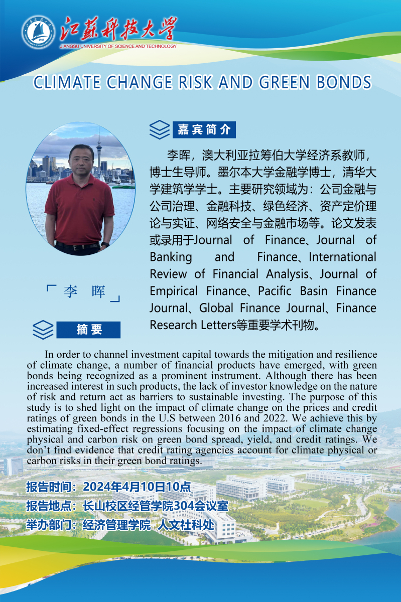 报告人简介:李晖,澳大利亚拉筹伯大学经济系教师,博士生导师。墨尔本大学金融学博士,清华大学建筑学学士。主要研究领域为:公司金融与公司治理、金融科技、绿色经济、资产定价理论与实证、网络安全与金融市场等。论文发表或录用于Journal of Finance、Journal of Banking and Finance、International Review of Financial Analysis、Journal of Empirical Finance、Pacific Basin Finance Journal、Global Finance Journal、Finance Research Letters等重要学术刊物。