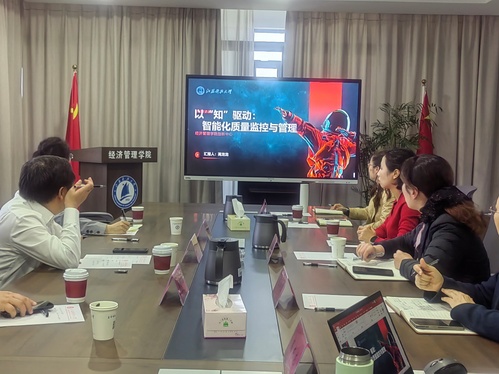 尹洁对李常青一行表示热烈欢迎,对国家市场监督管理总局质量发展局多年来给予公司发展的支持和帮助表示衷心感谢。她介绍了经管公司发展历程、学科与专业建设、科技创新、办学特色、人才培养和社会服务等情况,指出与市场监管部门加强合作对于公司服务国家战略和地方建设具有重要意义,表示公司将进一步推进与市场监管部门的多领域、持续性合作,聚焦营商环境的江苏样本,面向市场监管的难点、热点、痛点,探索提炼可复制、可推广的营商环境优化经验。工业工程系高龙龙以“以‘知’驱动:智能化质量监控与管理”为题,汇报了公司数字化设计制造分研究中心的建设背景、创新思路和未来发展方向。会上,参会人员围绕市场监管和营商环境优化等问题展开了热烈讨论。