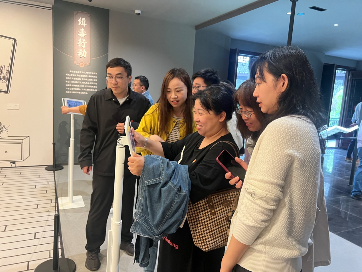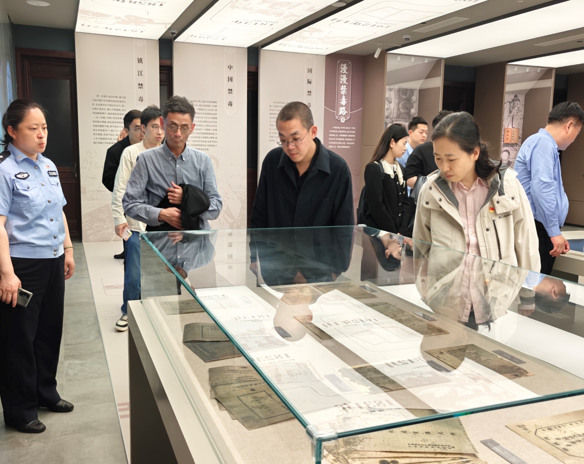 镇江市禁毒教育基地以“文字”“文书”“文典”“文化”为线索,深度发掘、融合与禁毒相关的镇江历史人文,通过艺术与技术的交融,再现中华文明中具有当代价值、禁毒意义的思想观念、传递禁毒正能量。在讲解员的带领下,参观人员依次参观各个展区,观看宣传图片、仿真模型、宣传视频,体验全息人体模拟系统等高新科技设备,直观认识到毒品的种类及危害,深入了解禁毒历史、法律等相关知识。