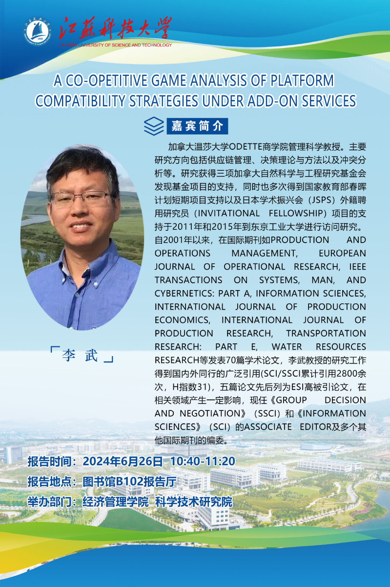 报告人简介:加拿大温莎大学Odette商公司管理科学教授。主要研究方向包括供应链管理、决策理论与方法以及冲突分析等。研究获得三项加拿大自然科学与工程研究基金会发现基金项目的支持,同时也多次得到教育部春晖计划短期项目支持以及日本学术振兴会(JSPS)外籍聘用研究员(Invitational Fellowship)项目的支持于2011年和2015年到东京工业大学进行访问研究。自2001年以来,在国际期刊如Production and Operations Management, European Journal of Operational Research, IEEE Transactions on Systems, Man, and Cybernetics: Part A, Information Sciences, International Journal of Production Economics, International Journal of Production Research, Transportation Research: Part E, Water Resources Research等发表70篇学术论文,李武教授的研究工作得到国内外同行的广泛引用(SCI/SSCI累计引用2800余次,h指数31),五篇论文先后列为ESI高被引论文,在相关领域产生一定影响,现任《Group Decision and Negotiation》(SSCI)和《Information Sciences》(SCI)的Associate Editor及多个其他国际期刊的编委。