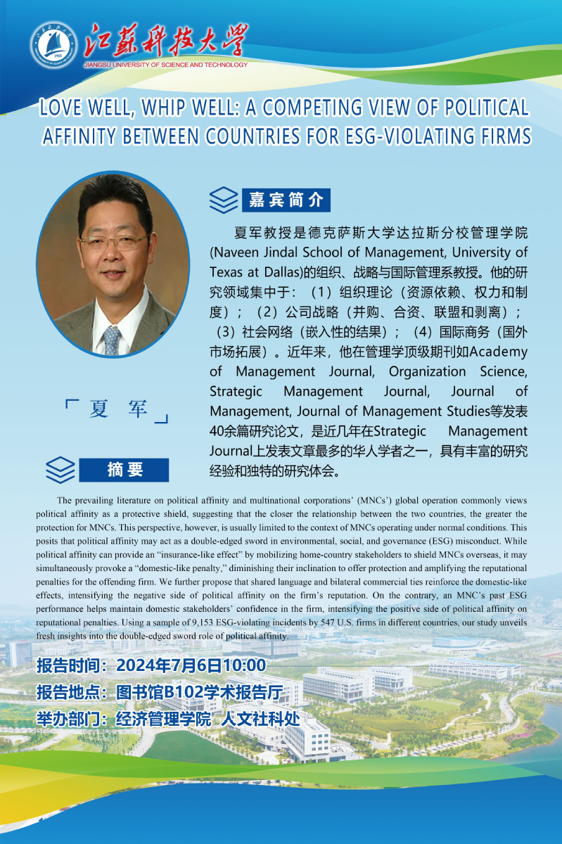 夏军教授是德克萨斯大学达拉斯分校管理公司(Naveen Jindal School of Management, University of Texas at Dallas)的组织、战略与国际管理系教授。他的研究领域集中于:(1)组织理论(资源依赖、权力和制度);(2)公司战略(并购、合资、联盟和剥离);(3)社会网络(嵌入性的结果);(4)国际商务(国外市场拓展)。近年来,他在管理学顶级期刊如Academy of Management Journal, Organization Science, Strategic Management Journal, Journal of Management, Journal of Management Studies等发表40余篇研究论文,是近几年在Strategic Management Journal上发表文章最多的华人学者之一,具有丰富的研究经验和独特的研究体会。