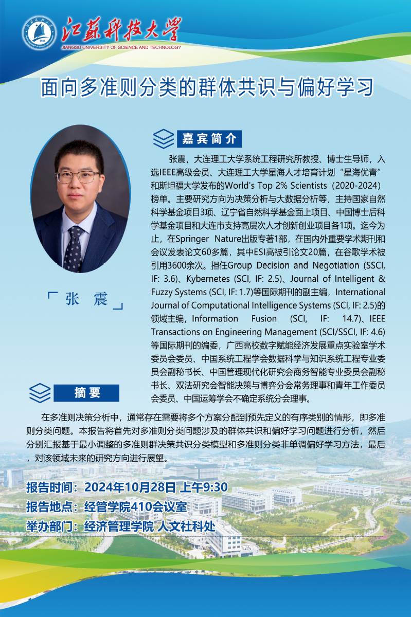 报告人简介:张震,大连理工大学系统工程研究所教授、博士生导师,入选IEEE高级会员、大连理工大学星海人才培育计划“星海优青”和斯坦福大学发布的World's Top 2% Scientists(2020-2024)榜单。主要研究方向为决策分析与大数据分析等,主持国家自然科学基金项目3项、辽宁省自然科学基金面上项目、中国博士后科学基金项目和大连市支持高层次人才创新创业项目各1项。迄今为止,在Springer Nature出版专著1部,在国内外重要学术期刊和会议发表论文60多篇,其中ESI高被引论文20篇,在谷歌学术被引用3600余次。担任Group Decision and Negotiation (SSCI, IF: 3.6)、Kybernetes (SCI, IF: 2.5)、Journal of Intelligent & Fuzzy Systems (SCI, IF: 1.7)等国际期刊的副主编,International Journal of Computational Intelligence Systems (SCI, IF: 2.5)的领域主编,Information Fusion (SCI, IF: 14.7)、IEEE Transactions on Engineering Management (SCI/SSCI, IF: 4.6)等国际期刊的编委,广西高校数字赋能经济发展重点实验室学术委员会委员、中国系统工程学会数据科学与知识系统工程专业委员会副秘书长、中国管理现代化研究会商务智能专业委员会副秘书长、双法研究会智能决策与博弈分会常务理事和青年工作委员会委员、中国运筹学会不确定系统分会理事。