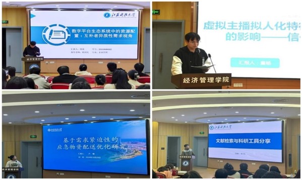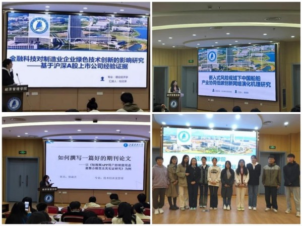 企业管理专业的周璘从互补者异质性需求的视角,探讨了数字平台生态系统中的资源配置,带领大家步入数字时代的新视野。童杨以人工智能与三维图像技术的蓬勃发展为背景,深入剖析了拟人化与信任感之间的微妙联系,为商家与虚拟主播平台的战略布局提出了宝贵的想法和建议。徐淑艺、黄子龙同学分享了高质量期刊论文的撰写经验,生动阐述了一篇论文的创作历程。杜欣泽立足于金融科技与绿色经济的交汇点,以其敏锐的问题意识、严谨的假设构建、扎实的实证分析,为金融科技如何赋能制造业绿色转型提供了实证支持与政策建议,展现了其深厚的学术功底与前瞻视野。卢敏以《基于需求紧迫性的紧急物资配送优化研究》为题,结合突发灾害情况,运用K-means聚类进行配送中心选址和受灾点划分,使应急车辆尽可能有限配送受灾需求紧迫的地区,为更合理高效地进行应急救援提供了最优路径规划。秦颖萱则以中国船舶产业在低碳转型中的挑战为背景,详细阐述了研究设计、模型选择、数据搜集与分析的全过程。