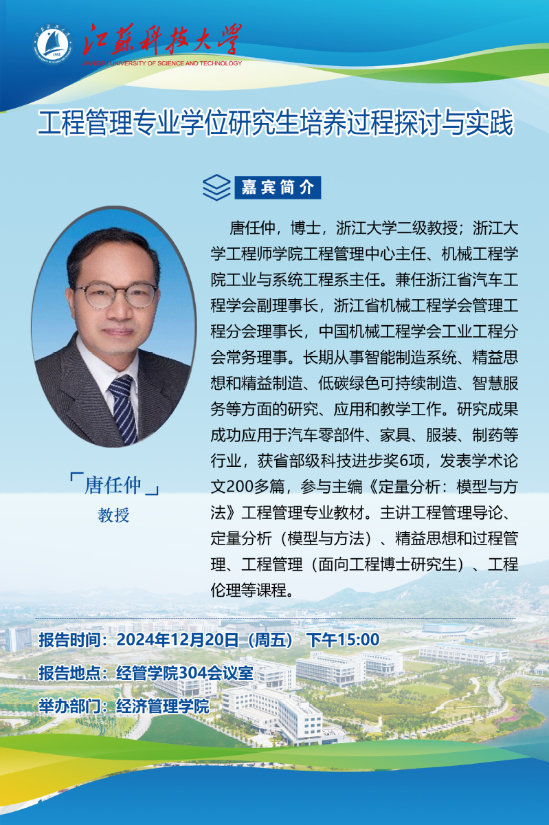报告人简介:唐任仲,博士,浙江大学二级教授;浙江大学工程师公司工程管理中心主任、机械工程公司工业与系统工程系主任。兼任浙江省汽车工程学会副理事长,浙江省机械工程学会管理工程分会理事长,中国机械工程学会工业工程分会常务理事。长期从事智能制造系统、精益思想和精益制造、低碳绿色可持续制造、智慧服务等方面的研究、应用和教学工作。研究成果成功应用于汽车零部件、家具、服装、制药等行业,获省部级科技进步奖6项,发表学术论文200多篇,参与主编《定量分析:模型与方法》工程管理专业教材。主讲工程管理导论、定量分析(模型与方法)、精益思想和过程管理、工程管理(面向工程博士研究生)、工程伦理等课程。