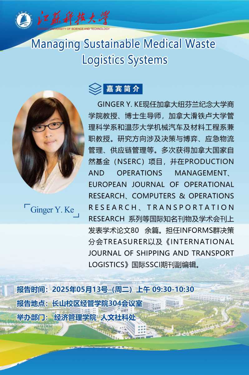 报告人简介:Ginger Y. Ke现任加拿大纽芬兰纪念大学商公司教授、博士生导师,加拿大滑铁卢大学管理科学系和温莎大学机械汽车及材料工程系兼职教授。研究方向涉及决策与博弈、应急物流管理、供应链管理等。多次获得加拿大国家自然基金(NSERC)项目,并在Production and Operations Management、European Journal of Operational Research、Computers & Operations Research、Transportation Research 系列等国际知名刊物及学术会刊上发表学术论文80 余篇。担任INFORMS群决策分会treasurer以及《International Journal of Shipping and Transport Logistics》国际SSCI期刊副编辑。