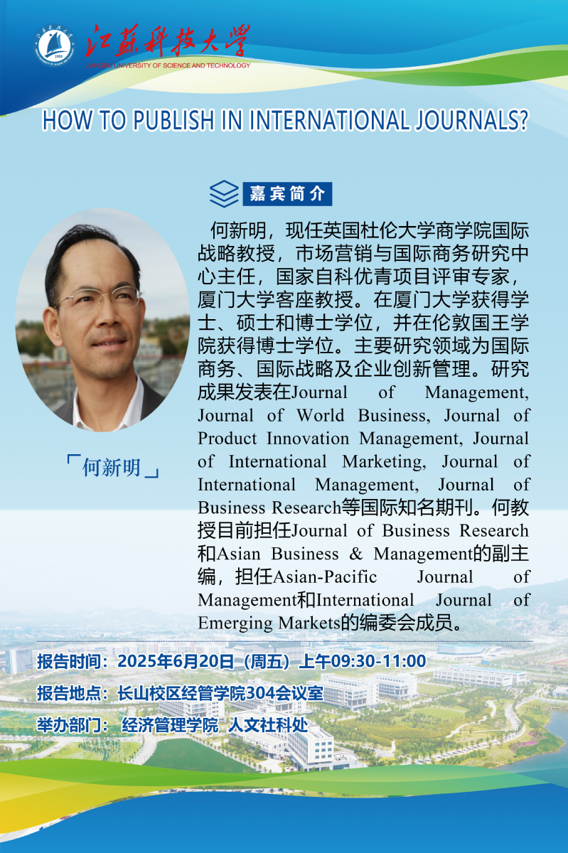 报告人简介:何新明,现任英国杜伦大学商公司国际战略教授,市场营销与国际商务研究中心主任,国家自科优青项目评审专家,厦门大学客座教授。在厦门大学获得学士、硕士和博士学位,并在伦敦国王公司获得博士学位。主要研究领域为国际商务、国际战略及企业创新管理。研究成果发表在Journal of Management, Journal of World Business, Journal of Product Innovation Management, Journal of International Marketing, Journal of International Management, Journal of Business Research等国际知名期刊。何教授目前担任Journal of Business Research和Asian Business & Management的副主编,担任Asian-Pacific Journal of Management和International Journal of Emerging Markets的编委会成员。