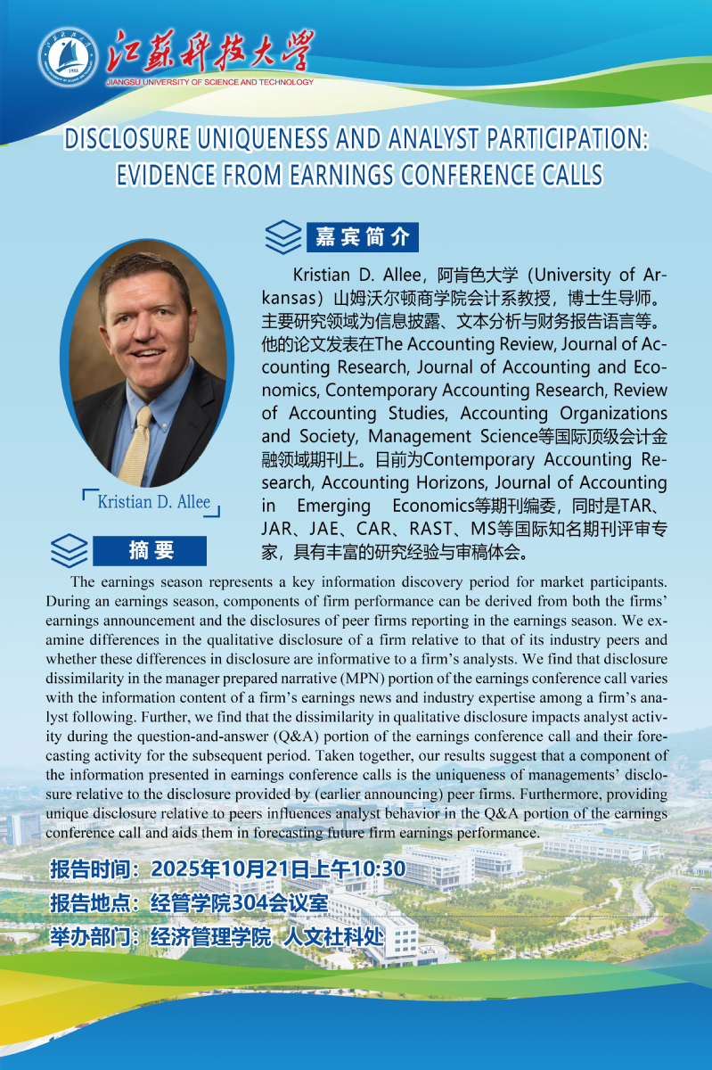 报告人简介:Kristian D. Allee,阿肯色大学(University of Arkansas)山姆沃尔顿商公司会计系教授,博士生导师。主要研究领域为信息披露、文本分析与财务报告语言等。他的论文发表在The Accounting Review, Journal of Accounting Research, Journal of Accounting and Economics, Contemporary Accounting Research, Review of Accounting Studies, Accounting Organizations and Society, Management Science等国际顶级会计金融领域期刊上。目前为Contemporary Accounting Research, Accounting Horizons, Journal of Accounting in Emerging Economics等期刊编委,同时是TAR、JAR、JAE、CAR、RAST、MS等国际知名期刊评审专家,具有丰富的研究经验与审稿体会。